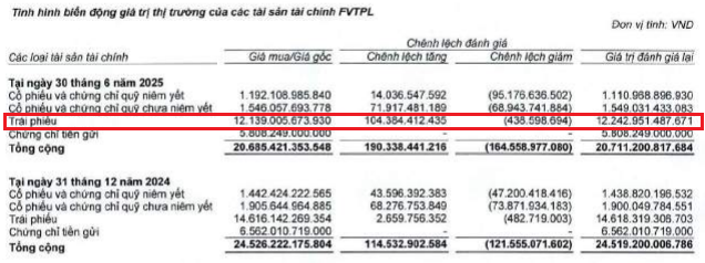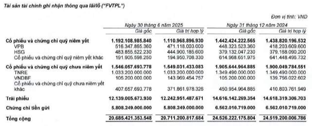 Trong danh mục tài sản tài chính FVTPL, trái phiếu chiếm hơn 12.2 ngàn tỷ đồng, sau đó là chứng chỉ tiền gửi hơn 5.8 ngàn tỷ đồng. Còn lại, Công ty đầu tư vào cổ phiếu và chứng chỉ quỹ, nổi bật là VPB, HSG và TNRE (Năng lượng tái tạo Trung Nam), VNDBF (quỹ đầu tư trái phiếu VND).