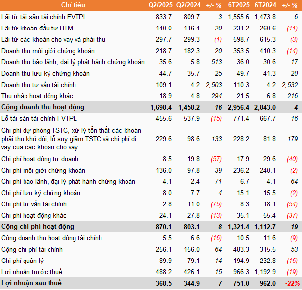 Kết quả kinh doanh quý 2 và lũy kế nửa đầu năm 2025 của VNDIRECT Đvt: Tỷ đồng