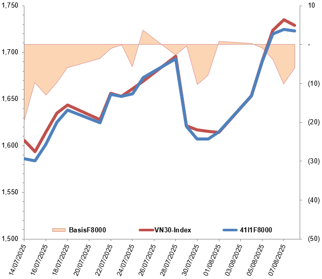 Các hợp đồng tương lai đồng loạt giảm điểm trong phiên giao dịch ngày 08/08/2025. Cụ thể, 41I1F8000 (F8000) giảm 0.09%, còn 1,723.2 điểm; 41I1G3000 (G3000) giảm 1.01%, còn 1,707.5 điểm; hợp đồng VN30F2509 (F2509) giảm 0.18%, còn 1,718.8 điểm; hợp đồng VN30F2512 (F2512) giảm 0.44%, còn 1,713.4 điểm. Chỉ số cơ sở VN30-Index kết phiên ở mức 1,729.08 điểm.