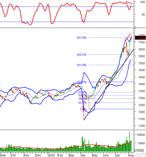 Hiện tại, chỉ số đang kiểm tra lại ngưỡng Fibonacci Projection 261.8% (tương đương vùng 1,725-1,750 điểm) trong bối cảnh Stochastic Oscillator đang hình thành phân kỳ giá xuống (Bearish Divergence) trong vùng quá mua (Overbought).