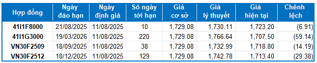 Dựa trên phương pháp định giá hợp lý với thời điểm khởi đầu ngày 11/08/2025, khung giá hợp lý của các hợp đồng tương lai đang được giao dịch trên thị trường được thể hiện như sau: