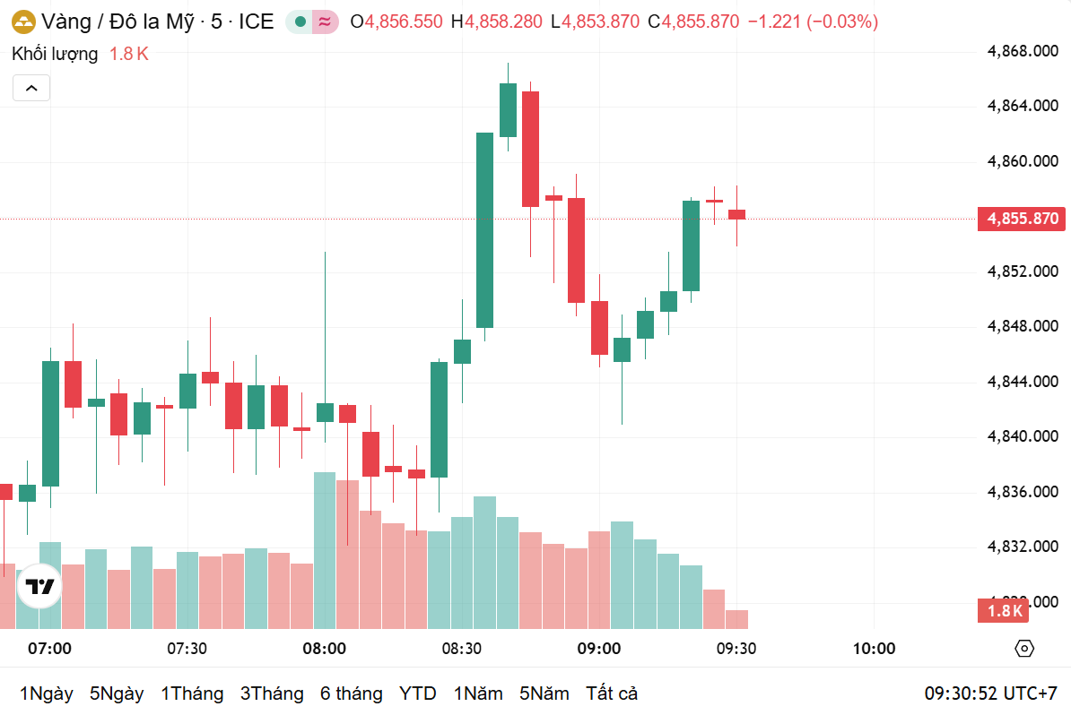 Thời điểm 9h30 theo giờ Việt Nam, giá vàng thế giới giao ngay ở mức 4.856 USD/ounce, giảm 2,89% trong 24 giờ qua, tương ứng với mức giảm 144,72 USD/ounce. Hiện, giá vàng thế giới quy đổi sang Việt Nam đồng khoảng 158,7 triệu đồng/lượng.