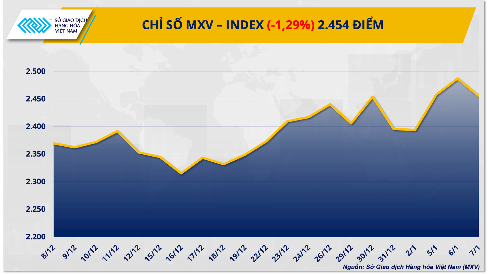 Diễn biến trái chiều của cán cân cung - cầu đã tạo nên sự phân hóa rõ nét trên thị trường hàng hóa trong phiên giao dịch ngày 7/1. Tâm điểm đổ dồn vào đà giảm sâu của giá bạch kim khi thị trường dự báo chuyển sang trạng thái thặng dư. Chốt phiên, chỉ số MXV-Index giảm gần 1,35% xuống mức 2.454 điểm.