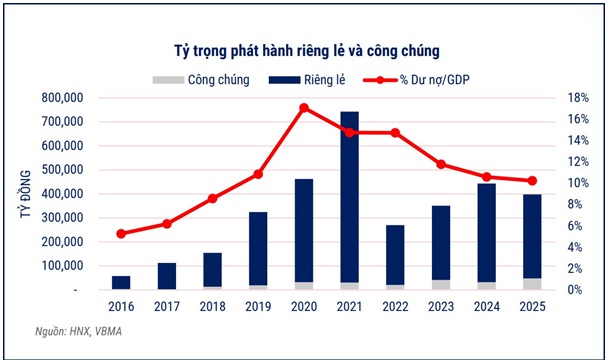Tỷ trọng phát hành trái phiếu riêng lẻ và công chúng của các năm theo báo cáo thị trường trái phiếu Việt Nam quý 3/2025 của VBMA. |