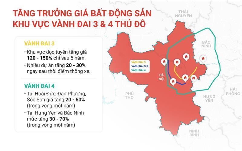 Bất động sản khu vực Vành đai 3 & 4 Thủ đô tăng giá. Đồ họa: Centa Riverside, dữ liệu tổng hợp