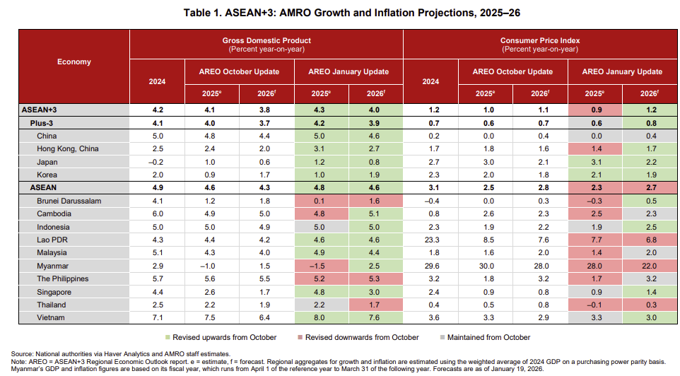 Ngày 21/1/2026, Văn phòng nghiên cứu kinh tế vĩ mô ASEAN+3 ( AMRO) đã công bố bản cập nhật hàng quý về Triển vọng Kinh tế Khu vực ASEAN+3 (AREO).