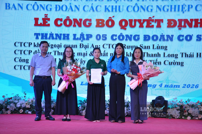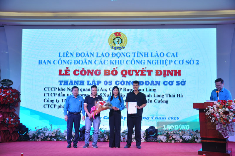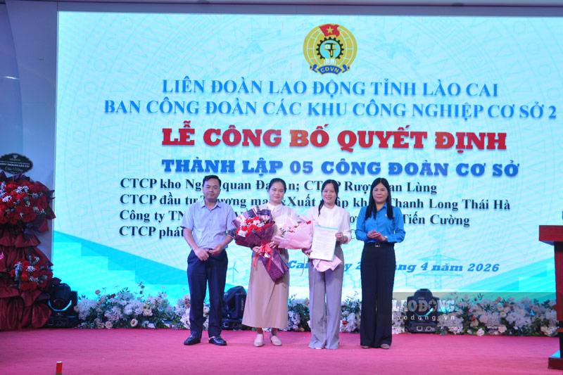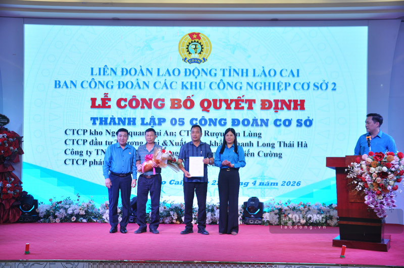 Trong đó, các công đoàn cơ sở được thành lập tại các doanh nghiệp gồm: Công ty Cổ phần Đầu tư Thương mại và Xuất nhập khẩu Thanh Long Thái Hà; Công ty TNHH MTV Xây dựng và Thương mại Tiến Cương; Công ty Cổ phần Phát triển Giáo dục ARMY Lào Cai; Công ty Cổ phần Kho ngoại quan Đại An; Công ty Cổ phần Rượu San Lùng.