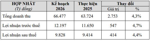 Năm 2026 lên kế hoạch doanh thu và lợi nhuận sau thuế lần lượt gần 66.5 ngàn tỷ đồng và hơn 9.8 ngàn tỷ đồng.