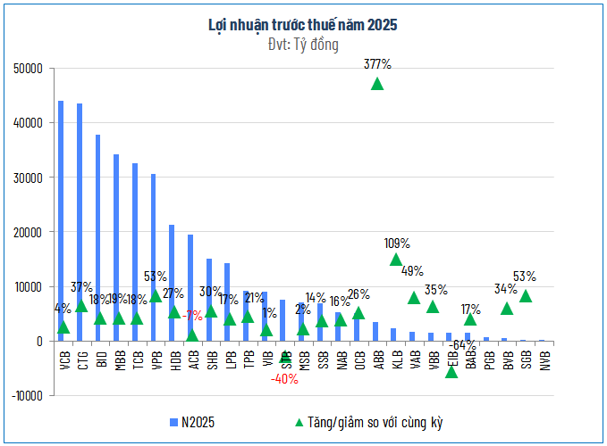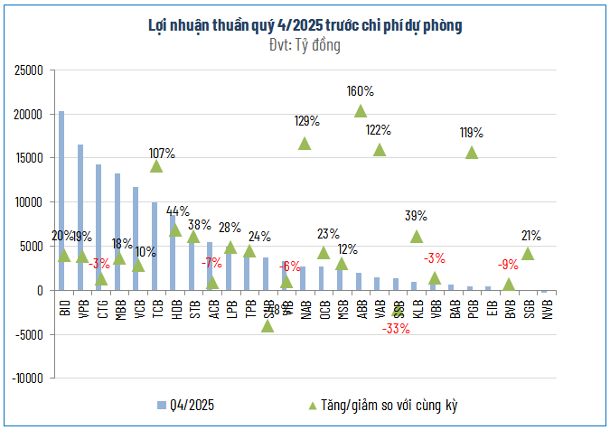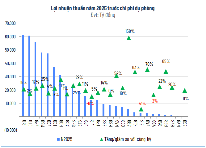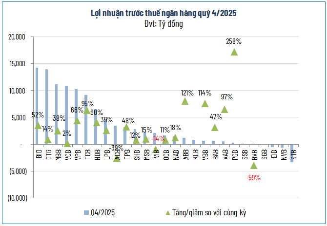 Tuy nhiên, phía sau những gam màu hồng, sự phân hóa trong nội tại ngành đang trở nên rõ rệt hơn bao giờ hết. Trong khi các ông lớn báo lãi kỷ lục, vẫn có 4 ngân hàng sụt giảm lợi nhuận và 4 nhà băng khác rơi vào tình trạng lỗ. Nguyên nhân chính được xác định là do các đơn vị này phải dồn lực thực hiện trích lập dự phòng rủi ro tín dụng ở mức cao, chấp nhận hy sinh lợi nhuận ngắn hạn để ưu tiên cho sự an toàn và làm sạch bảng cân đối kế toán cho hành trình dài hơi phía trước.