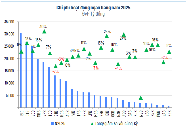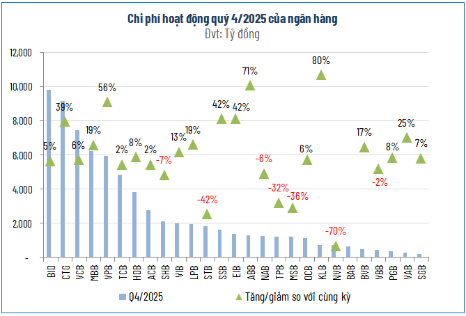 Kết quả kinh doanh của 27 ngân hàng niêm yết trong quý này tiếp tục phản ánh đà tăng trưởng ổn định ở cả hai trụ cột chính. Thu nhập lãi thuần và thu nhập ngoài lãi lần lượt đạt hơn 154,000 tỷ đồng và gần 55,000 tỷ đồng, tương ứng với mức tăng 15% và 17% so với cùng kỳ năm trước. Trong khi đó, việc tối ưu hóa bộ máy đã giúp chi phí hoạt động tăng chậm hơn ở mức 7%, đạt gần 71,000 tỷ đồng. Sự chênh lệch tích cực này đã thúc đẩy lợi nhuận thuần từ hoạt động kinh doanh chạm mốc hơn 138,000 tỷ đồng, tăng trưởng 20% so với quý 4 năm ngoái.