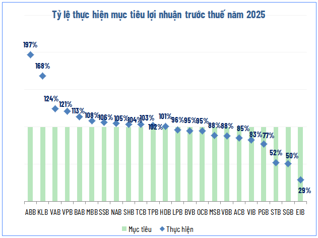 Phía sau con số lợi nhuận “cao ngất ngưỡng”, vẫn còn đó những nốt trầm khi nhiều ngân hàng không kịp về đích như kỳ vọng. Điểm sáng rực rỡ nhất trong cuộc đua này gọi tên ABBank, dẫn đầu về tốc độ tăng trưởng còn gây kinh ngạc khi vượt tới 97% kế hoạch năm - xác lập mức vượt chỉ tiêu cao nhất toàn ngành trong năm 2025.