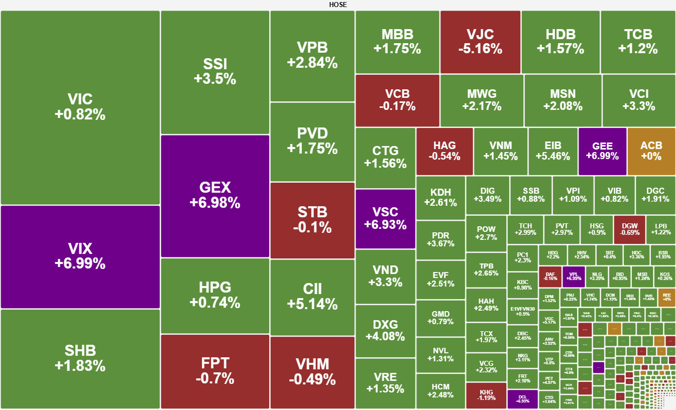 Phiên sáng nay chứng kiến sắc xanh quay trở lại thị trường với lực cầu gia tăng ngay từ đầu phiên, kéo thanh khoản cải thiện đáng kể so với cùng thời điểm phiên trước. Dù chỉ số chủ yếu giằng co quanh mốc 1.670 điểm, tâm lý thị trường được củng cố nhờ sự tỏa sáng của các mã GEE, VIX (tăng trần) và GEX.