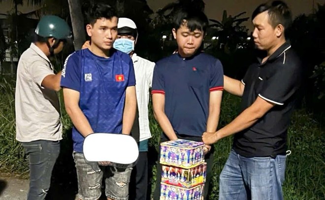 Qua kiểm tra, lực lượng công an phát hiện người điều khiển xe tên Phan Chí Can (sinh năm 2000, ngụ tỉnh An Giang) chở Trần Thái Sang (sinh năm 2005, ngụ TP Cần Thơ), trên xe có 1 bao tải màu đỏ chứa 10 hộp pháo (loại pháo hoa có nguồn gốc nước ngoài), trọng lượng 15,5 kg.