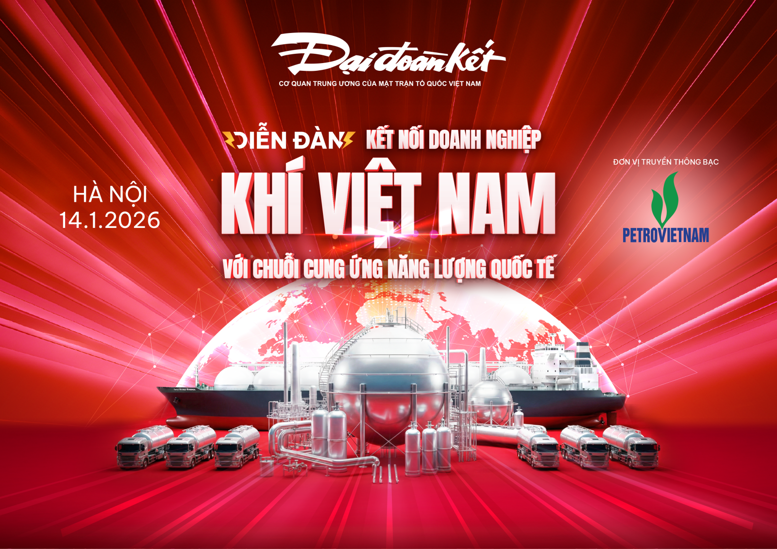 Xuất phát từ yêu cầu đó, Báo Đại đoàn kết phối hợp cùng với các đơn vị liên quan tổ chức chương trình “Diễn đàn Kết nối doanh nghiệp khí Việt Nam với chuỗi cung ứng năng lượng Quốc tế" là hết sức cần thiết và ý nghĩa. Chương trình có sự đồng hành của Tập đoàn Công nghiệp – Năng lượng Quốc gia Việt Nam (PVN). Diễn đàn sẽ được tổ chức sáng ngày 14/1/2026 tại khách sạn Du Parc (Hà Nội) nhằm tạo không gian để các nhà hoạch định chính sách, chuyên gia, doanh nghiệp và cộng đồng cùng thảo luận, trao đổi thông tin, cùng tìm kiếm những hướng đi, giải pháp thúc đẩy sự phát triển của thị trường khí LNG tại Việt Nam nói riêng và hướng đi giúp doanh nghiệp khí Việt Nam vươn mình ra thị trường quốc tế.