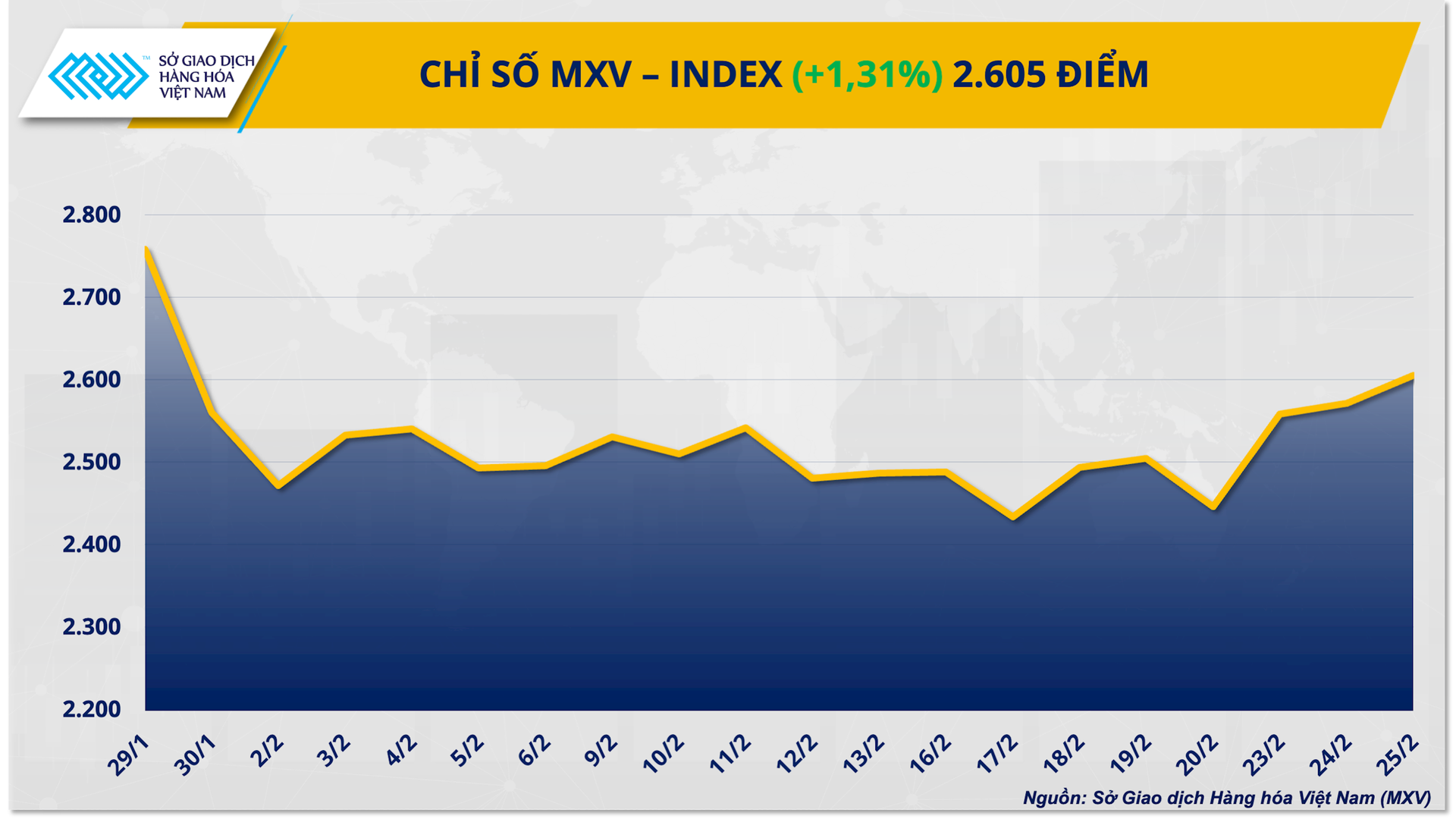 Sức nóng của thị trường kim loại quý gia tăng rõ rệt khi giá bạc thế giới nối dài chuỗi tăng sang phiên thứ 6 liên tiếp. Trái ngược, giá ca cao tiếp tục lao dốc về đáy ba năm dưới áp lực dư cung lớn tại Tây Phi. Đóng cửa, lực mua tiếp tục chiếm ưu thế kéo chỉ số MXV-Index tăng hơn 1,3%, lên 2.605 điểm.
