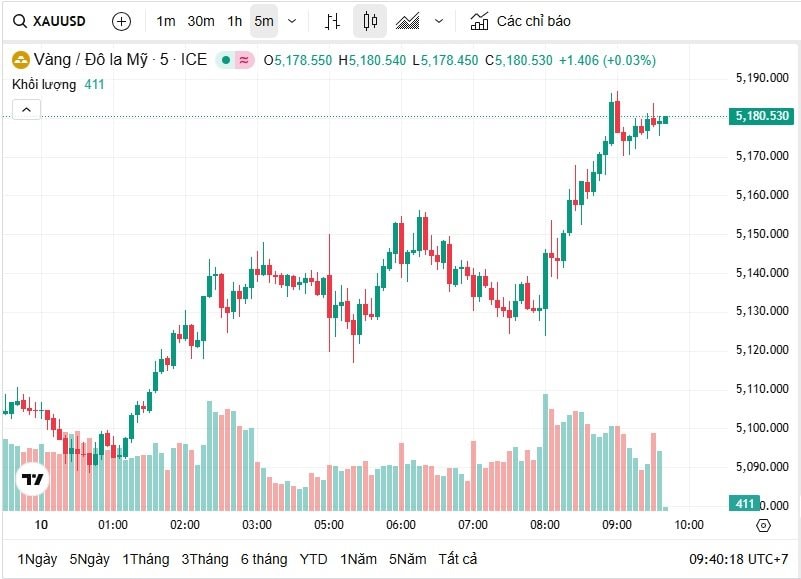 Thời điểm 9h40 theo giờ Việt Nam, giá vàng thế giới giao ngay ở mức 5.179 USD/ounce, tăng 0,15% trong 24 giờ qua, tương ứng với tăng 7,88 USD/ounce. Hiện, giá vàng thế giới quy đổi sang tiền Việt Nam đồng khoảng 164,3 triệu đồng/lượng.