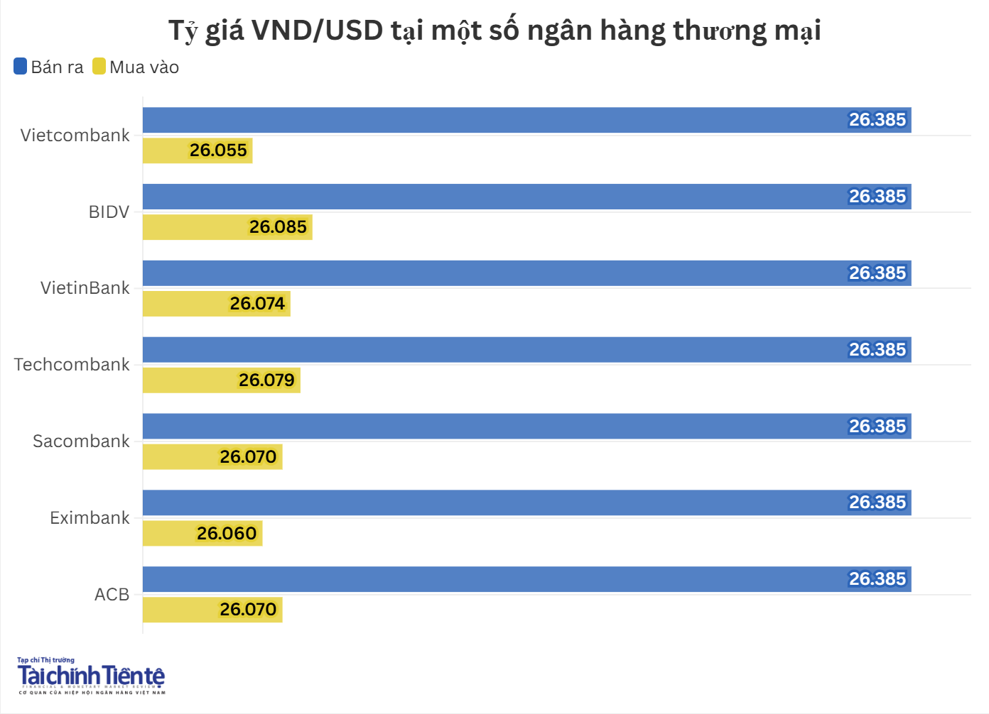 Hiện, giá mua thấp nhất ở mức 26.055 VND/USD, giá mua cao nhất ở mức 26.085 VND/USD. Giá bán ra được các ngân hàng đồng loạt niêm yết ở mức 26.385 VND/USD.