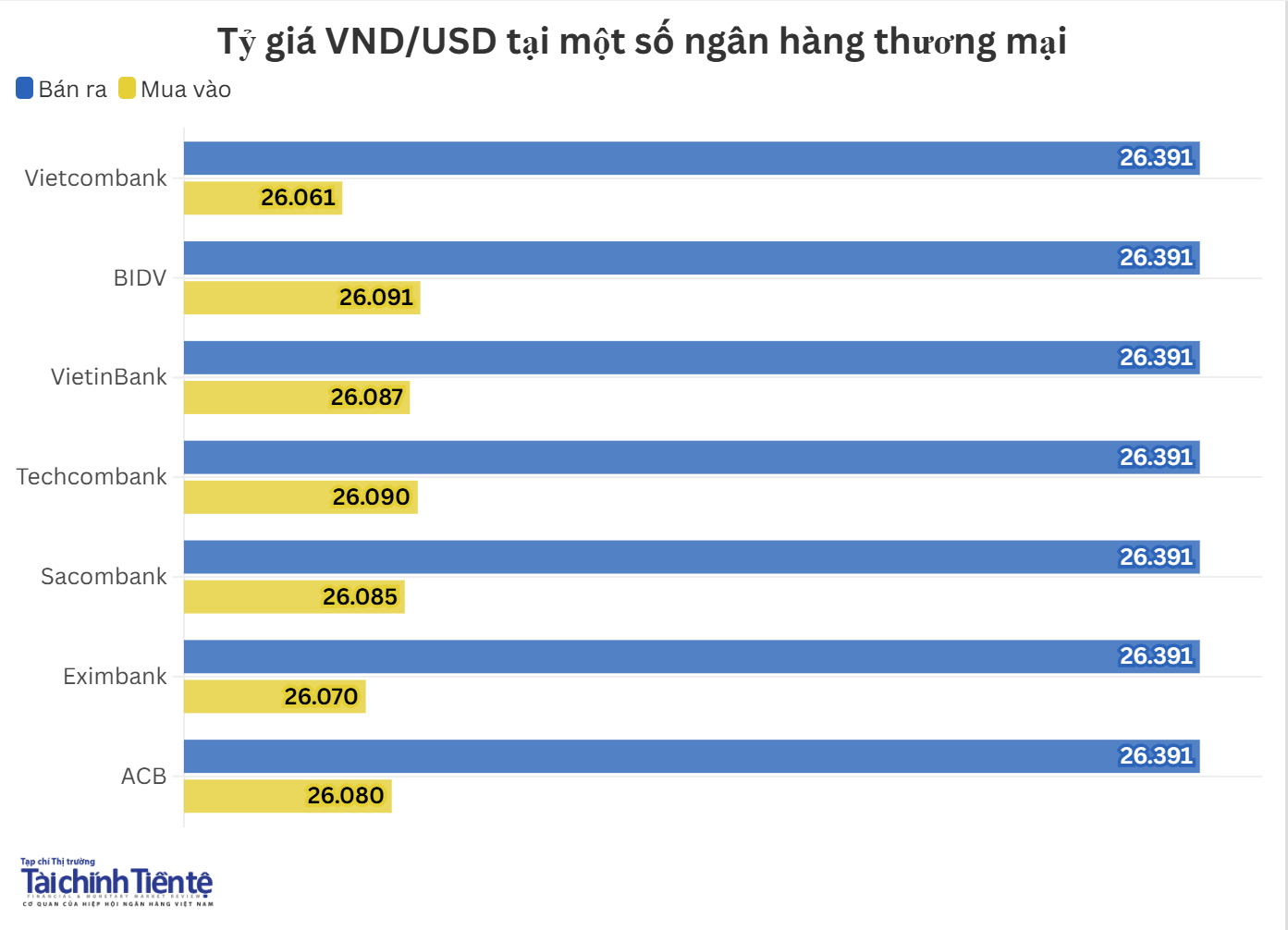 Hiện, giá mua thấp nhất ở mức 26.061 VND/USD, giá mua cao nhất ở mức 26.091 VND/USD. Giá bán ra được các ngân hàng đồng loạt niêm yết ở mức 26.391 VND/USD.