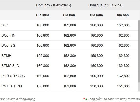 Công ty Vàng bạc đá quý Sài Gòn (SJC), Tập đoàn Vàng bạc Đá quý DOJI và Bảo Tín Minh Châu cùng niêm yết giá vàng miếng SJC mua vào-bán ra ở mức 160,8-162,8 triệu đồng/lượng, đứng yên ở cả chiều mua và chiều bán ra so với chốt phiên trước.