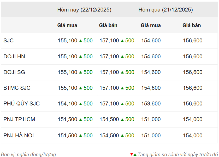 Phiên giao dịch sáng ngày 22/12, giá vàng trong nước được các thương hiệu đồng loạt điều chỉnh tăng 500.000 đồng/lượng. Thị trường trong nước tiếp tục theo xu hướng tăng kỷ lục của thế giới.