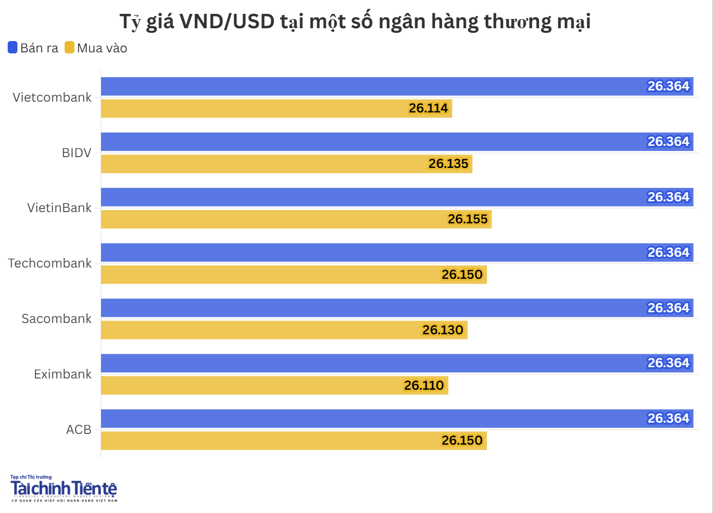 Hiện, giá mua thấp nhất ở mức 26.110 VND/USD, giá mua cao nhất ở mức 26.155 VND/USD. Giá bán được các ngân hàng niêm yết đồng loạt ở mức 26.364 VND/USD.