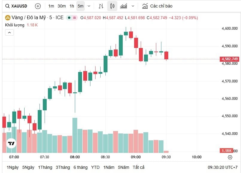 Thời điểm 9h30 theo giờ Việt Nam, giá vàng thế giới giao ngay ở mức 4.591 USD/ounce, tăng 4,25% trong 24 giờ qua, tương ứng với mức tăng 187,3 USD/ounce. Hiện, giá vàng thế giới quy đổi sang Việt Nam đồng khoảng 145,9 triệu đồng/lượng.