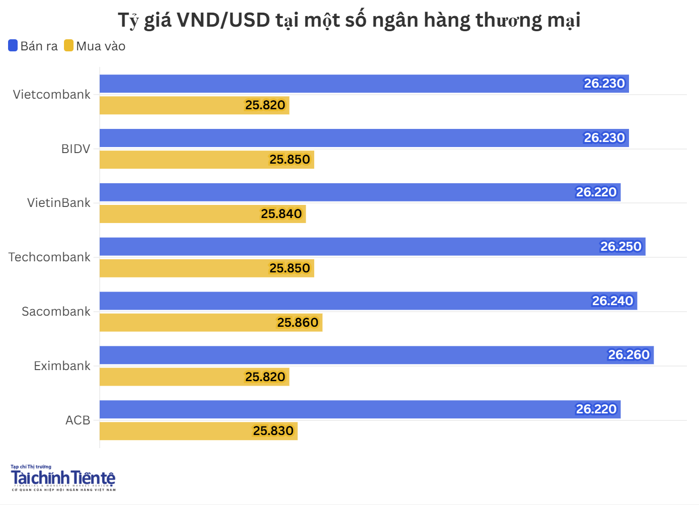 Hiện, giá mua thấp nhất ở mức 25.820 VND/USD, giá mua cao nhất ở mức 25.860 VND/USD. Giá bán ra thấp nhất ở mức 26.220 VND/USD, giá bán cao nhất ở mức 26.260 VND/USD.