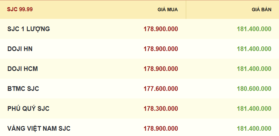 Công ty Vàng bạc đá quý Sài Gòn (SJC), Tập đoàn Vàng bạc Đá quý DOJI cùng niêm yết giá vàng miếng SJC mua vào-bán ra ở mức 178,9-181,4 triệu đồng/lượng, tăng 4,1 triệu đồng ở cả chiều mua và chiều bán ra so với chốt phiên hôm qua.