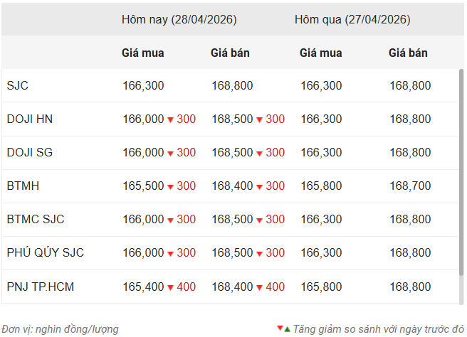 Công ty Vàng bạc đá quý Sài Gòn (SJC) niêm yết giá vàng miếng SJC mua vào-bán ra ở mức 166,3-168,8 triệu đồng/lượng, đi ngang chiều mua và chiều bán so với chốt phiên hôm qua (ngày 27/4).