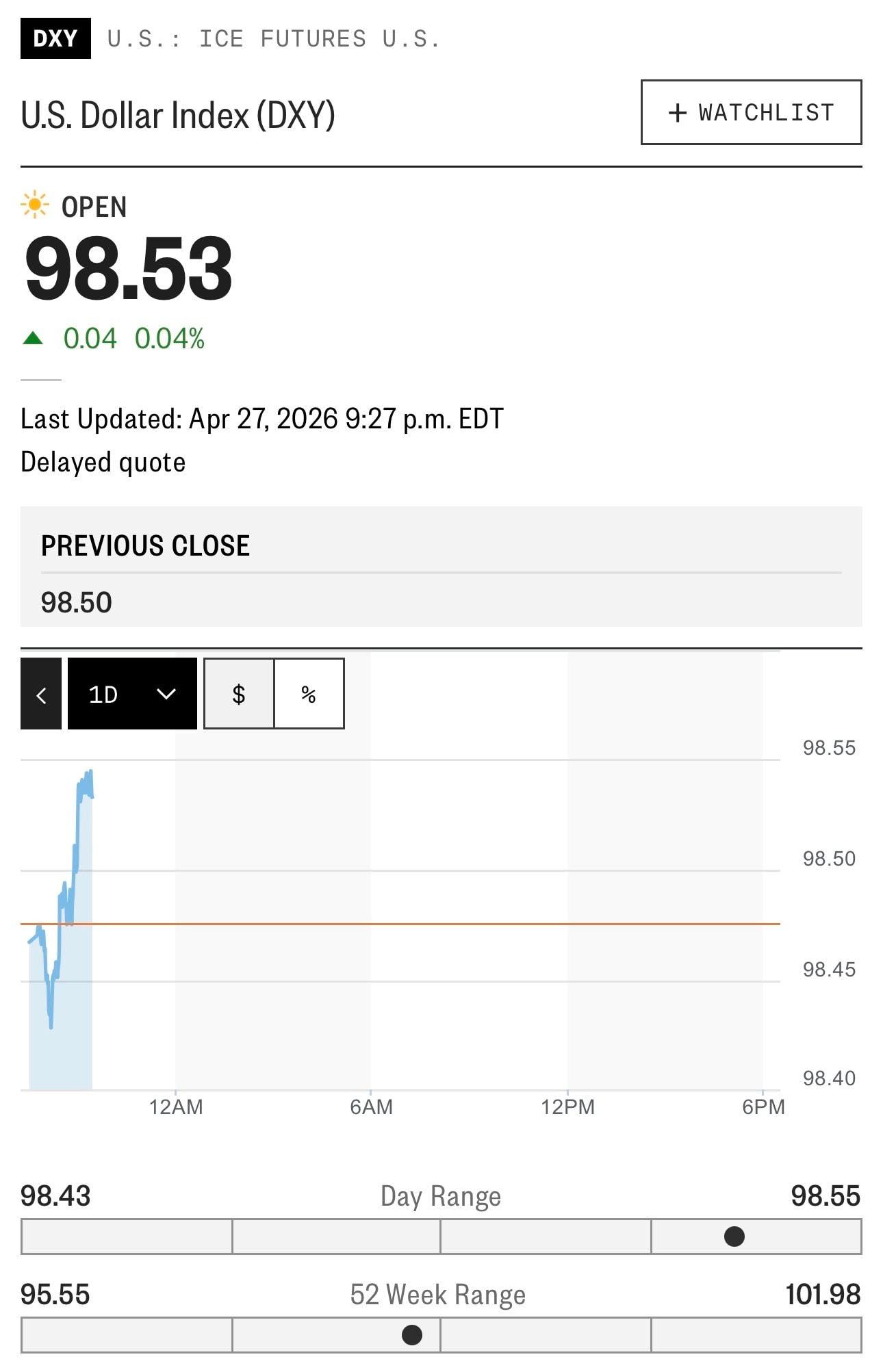 Thời điểm 8h30 (ngày 28/4, giờ Việt Nam), trên thị trường thế giới, chỉ số USD Index (DXY) - thước đo sức mạnh của đồng bạc xanh ở mức 98,53 điểm, tăng 0,04 điểm so với phiên trước đó.