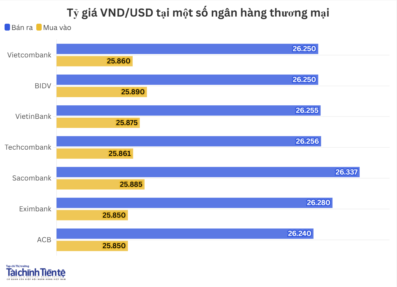 Hiện, giá mua thấp nhất ở mức 25.850 VND/USD, giá mua cao nhất ở mức 25.890 VND/USD. Giá bán thấp nhất ở mức 26.240 VND/USD, giá bán cao nhất ở mức 26.337 VND/USD.
