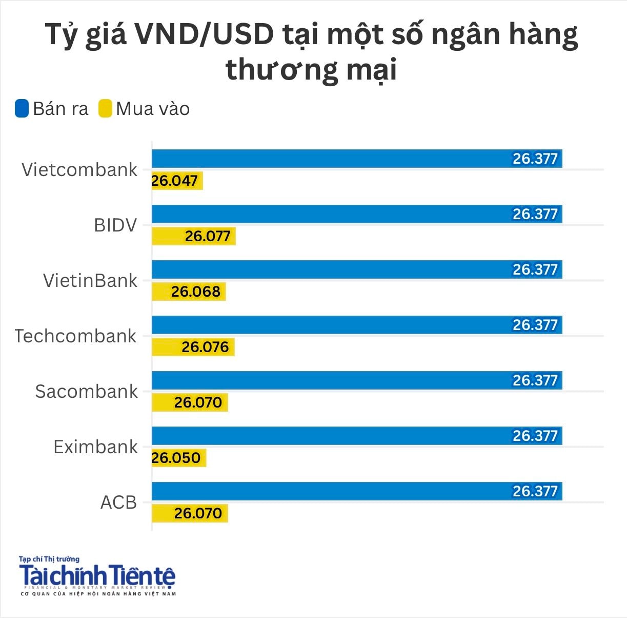 Hiện, giá mua thấp nhất ở mức 26.050 VND/USD, giá mua cao nhất ở mức 26.076 VND/USD. Giá bán ra được các ngân hàng đồng loạt niêm yết ở mức 26.377 VND/USD.