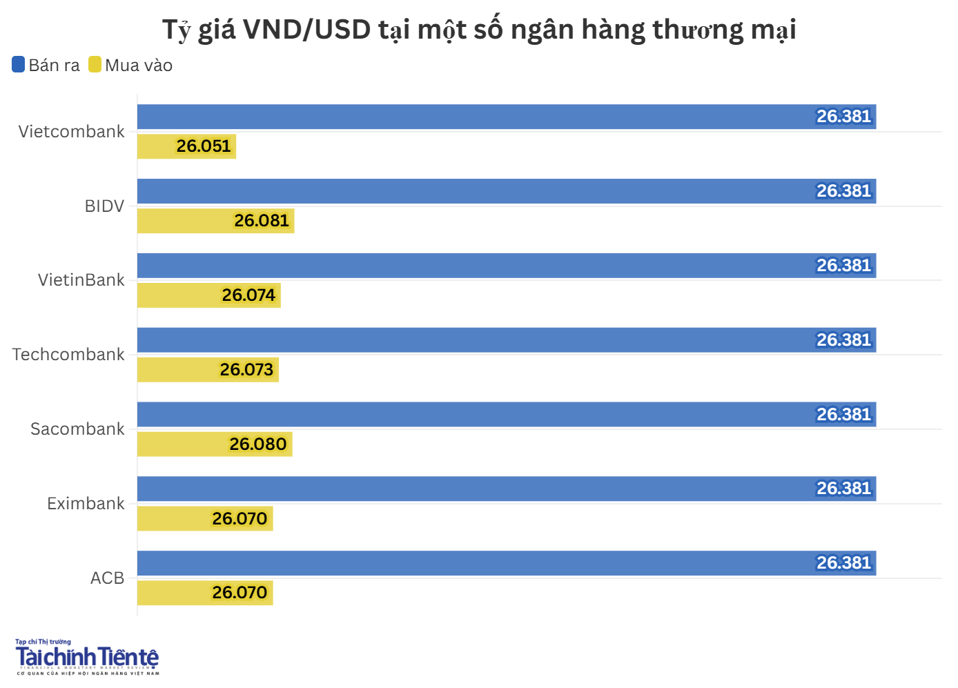 Hiện, giá mua thấp nhất ở mức 26.051 VND/USD, giá mua cao nhất ở mức 26.081 VND/USD. Giá bán ra được các ngân hàng đồng loạt niêm yết ở mức 26.381 VND/USD.