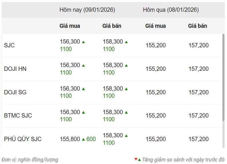Công ty Vàng bạc đá quý Sài Gòn (SJC), Tập đoàn Vàng bạc Đá quý DOJI và Bảo Tín Minh Châu cùng niêm yết giá vàng miếng SJC mua vào-bán ra ở mức 156,3-158,1 triệu đồng/lượng, tăng 1,1 triệu đồng ở cả chiều mua và chiều bán ra so với chốt phiên hôm qua.
