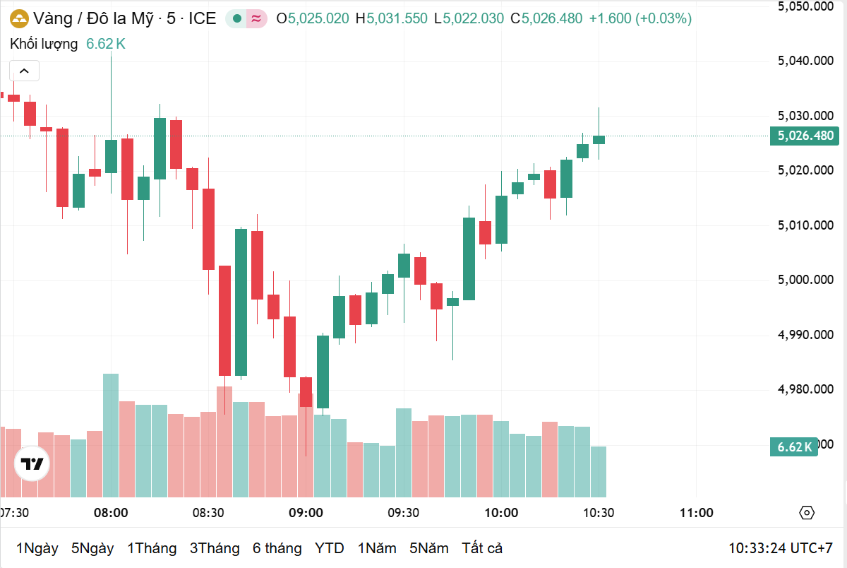 Thời điểm 10h15 theo giờ Việt Nam, giá vàng thế giới giao ngay ở mức 5.027 USD/ounce, tăng 1,44% trong 24 giờ qua, tương ứng với tăng 71,12 USD/ounce. Hiện, giá vàng thế giới quy đổi sang tiền Việt Nam đồng khoảng 158,4 triệu đồng/lượng.