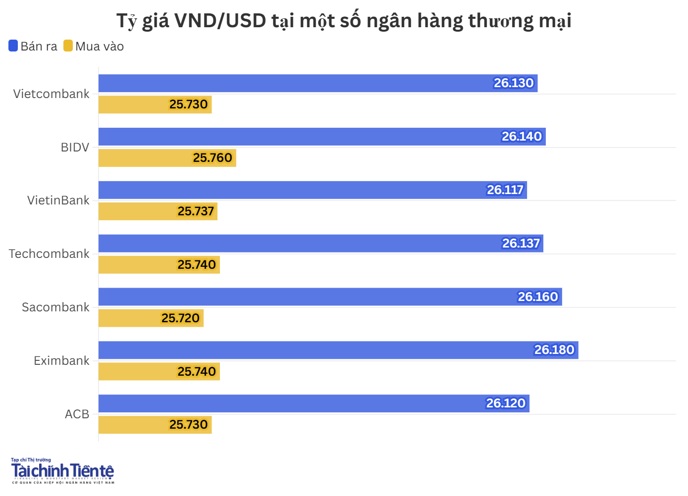 Hiện, giá mua thấp nhất ở mức 25.720 VND/USD, giá mua cao nhất ở mức 25.760 VND/USD. Giá bán ra thấp nhất ở mức 26.117 VND/USD, giá bán cao nhất ở mức 26.180 VND/USD.