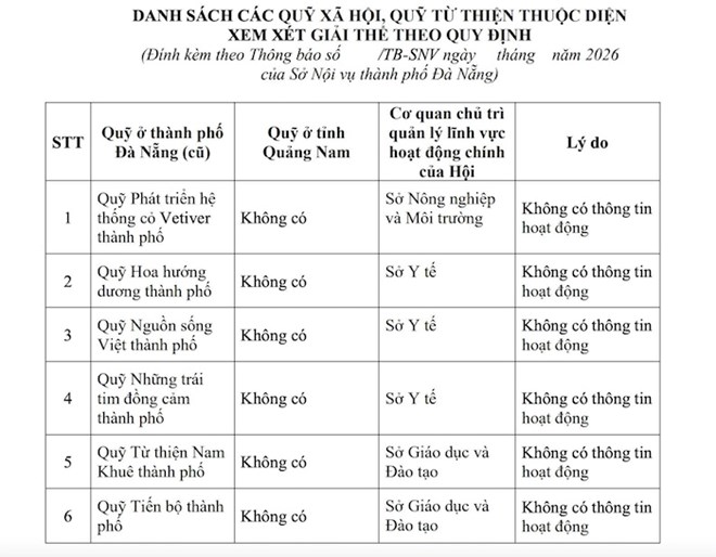 Đà Nẵng - Sở Nội vụ TP Đà Nẵng vừa phát đi thông báo công khai danh sách 6 quỹ xã hội, quỹ từ thiện trên địa bàn thuộc diện xem xét giải thể.